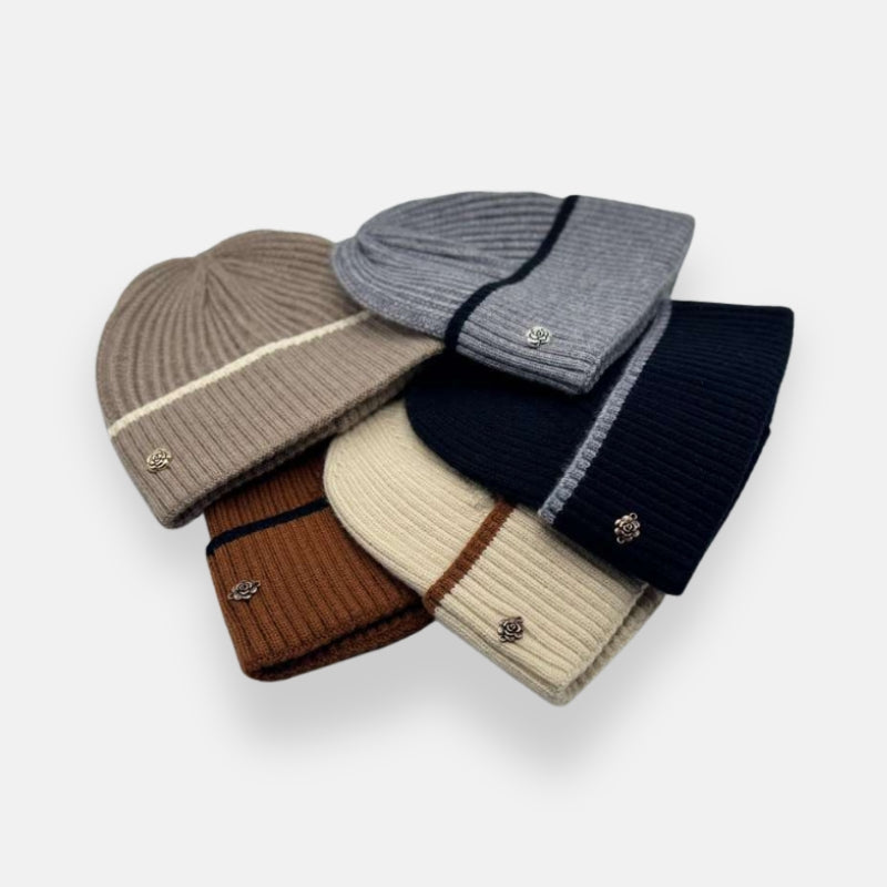 A soft ribbed knit beanie designed with a refined contrast trim and finished with a delicate rose charm detail.