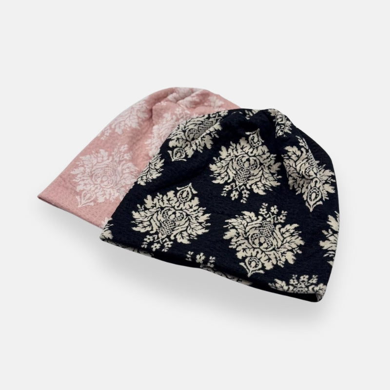 A soft beanie featuring a delicate floral pattern. Designed with a comfortable fit and lightweight feel.