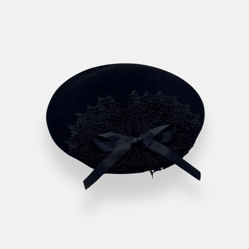 A classic beret featuring a delicate lace overlay and a small bow detail for an elegant touch.