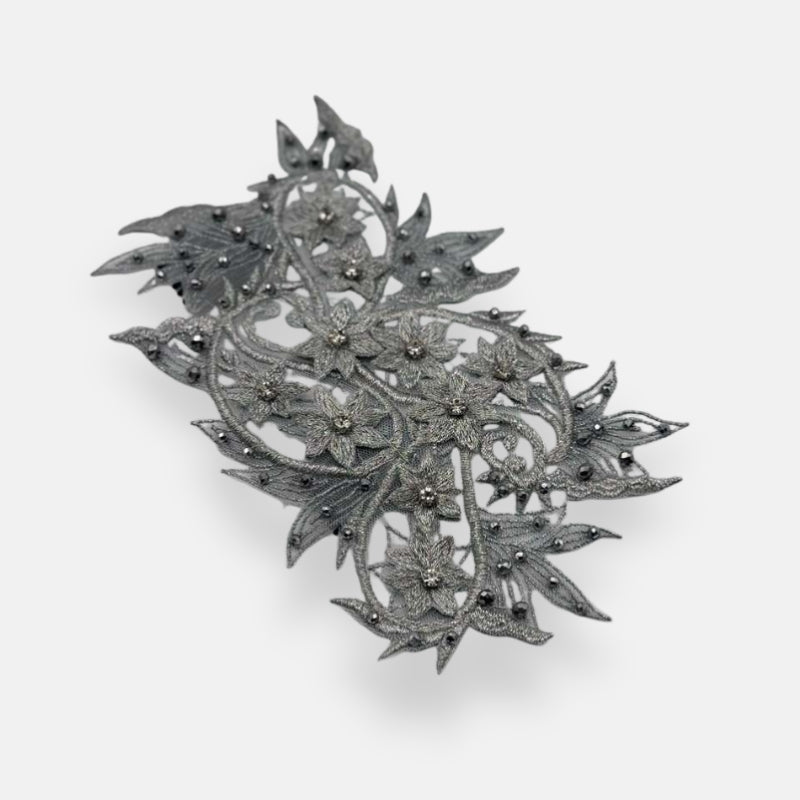 Delicate lace hair doily with floral detailing, rhinestones, and attached to a small slide-in comb for easy and secure wear.