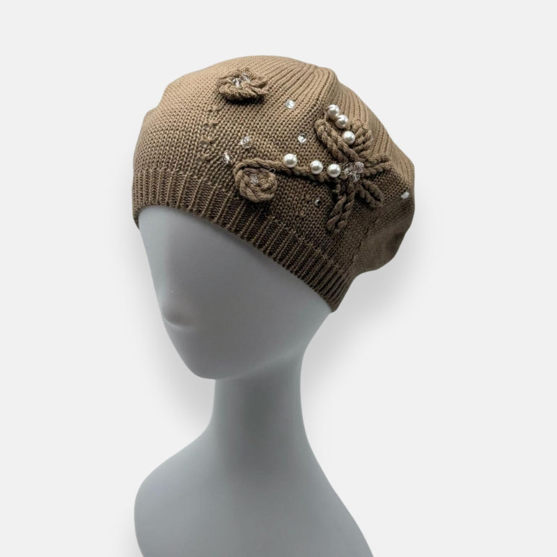 A beautifully detailed cotton beret featuring raised knit flowers, pearl clusters, and crystal accents.