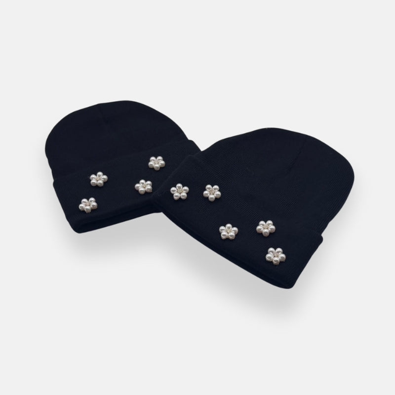 Ribbed Beanie With Pearl Floral Accents