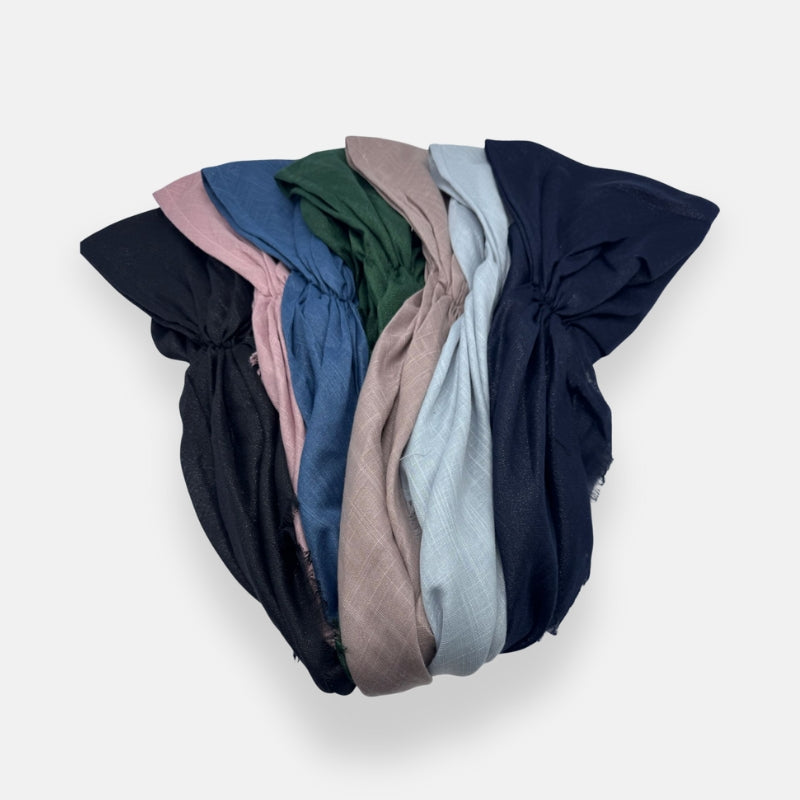 A soft and lightweight tie-back headscarf featuring a subtle shimmer for an elegant, polished look. These scarves are designed with long, comfortable ties for an easy and adjustable fit.